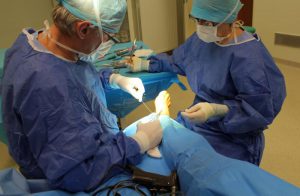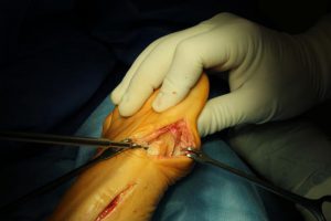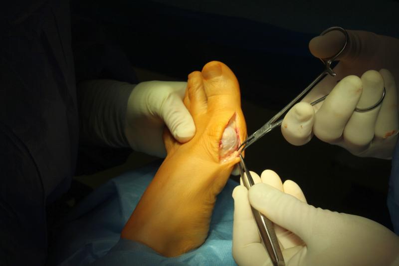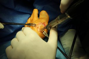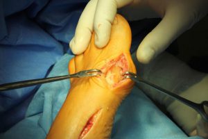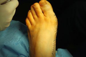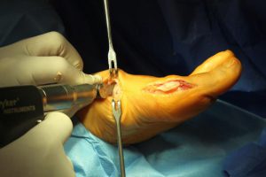 Tak wygląda w skrócie przykładowa operacja korekcji dwupoziomowej I kości śródstopia.